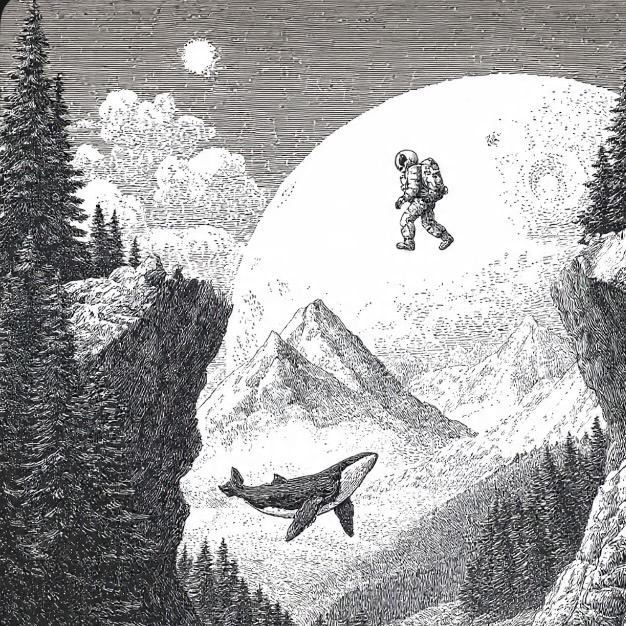One morning, Flash stood on his balcony, watching the morning light rake across the plains. The rays turned the crystals on in silent explosions of brilliant color. The little whale bobbed up and down playfully. Poikani entered Flash’s apartment, looking for the sphere. When he saw the calf, framed by the open doorway, and backlit by the sunrise, forming a halo, he froze. There was something about this young whale, beyond the color and how the patches of white traveled across its body.