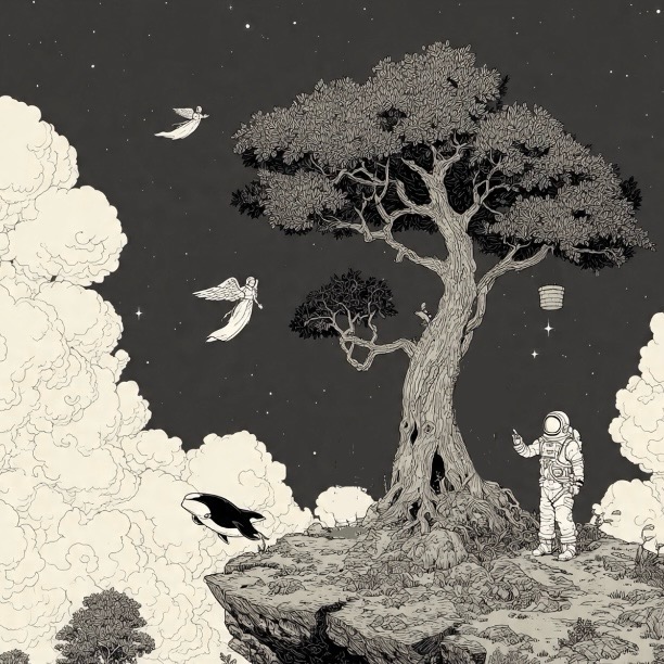 One of these angelic creatures swooped down and alighted in front of Flash Meridian. They stood face to face, and looked into each other’s eyes. Light seemed to emanate from the being. It placed its hand on Flash’s head, and peaceful waves rippled through his body. His inner child felt it, and Flash was reminded again that time was a construct that he had outgrown. He’d seen the picture of his life before crossing the invisible bridge. His life was not linear, but a painting he could move freely about in. The presence of his child self was proof of this. Because Olo was a painting of his life, this pinnacle was also part of him. The winged person didn’t speak. Words were not necessary. It just smiled. When it removed its hand from Flash’s head, all self doubt and concern was gone. Flash felt empty, in the most wondrous way. The being held its cupped hands above its head, and Bucket settled into them, with the sphere still aboard. Bucket and the sphere made soft chirping sounds which grew more exuberant. They sang together, and Bucket was filled with more love than he could hold. The trauma of his past loneliness evaporated into the thin air. The angel then turned to the whale and blessed it, too, before ascending again into the treetop.